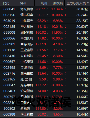 个股方面,海光信息、通富微电、中科曙光、华天科技、澜起科技5股获得超20亿元主力资金净流入,中国长城、中芯国际、工业富联等14股获得超10亿元净流入。